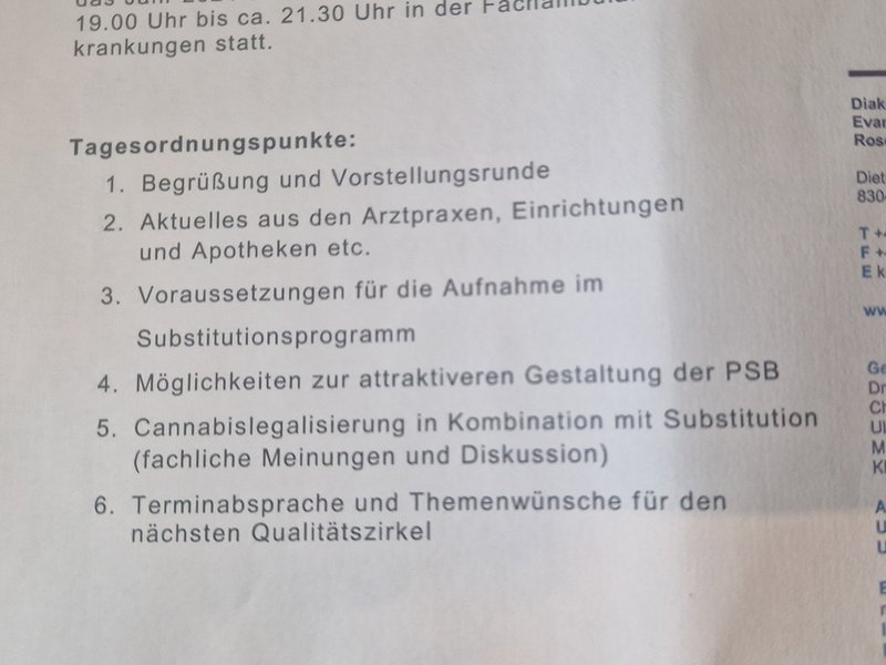 Seit Jahren bietet die Fachambulanz für Suchterkrankungen der Diakonie Rosenheim den Rahmen für diesen Fachaustausch. Neben Dr. Ruth Höfter, Chefärztin im Fachbereich Suchtmedizin im Inn-Salzach-Klinikum, nehmen weitere substituierende Ärzte und Ärztinnen aus dem Landkreis Rosenheim, Apotheker/Apothekerin, Vertreter/-innen der Bewährungshilfe und Fachkräfte aus der ambulanten und stationären Sucht- und Eingliederungshilfe an diesem Fachaustausch teil. Es werden die aktuellen Entwicklungen und Herausforderungen in der Suchthilfepraxis besprochen und eine feste Tagesordnung strukturiert die Treffen.