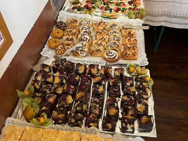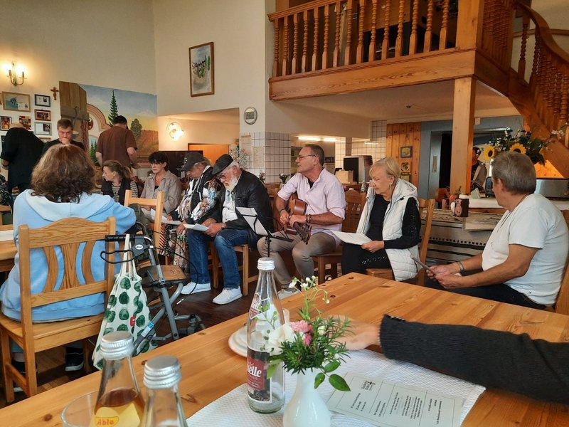 Anschließend traf man sich erneut im Speisesaal bei Kaffee und Kuchen, die, wie der Mittags-Imbiss auch, von der fleißigen Küchenmannschaft gemeinsam mit Mitarbeitenden zubereitet worden waren. Für musikalische Unterhaltung sorgte die hauseigene Gesangsgruppe, bestehend aus sechs Bewohner/-innen und dem Hausleiter. Mit bekannten deutschen und englischen Liedern begeisterten sie das wunderbare Publikum, das begeistert mitsang. Zum Abschluss wurden die Sieger der Hausolympiade geehrt.