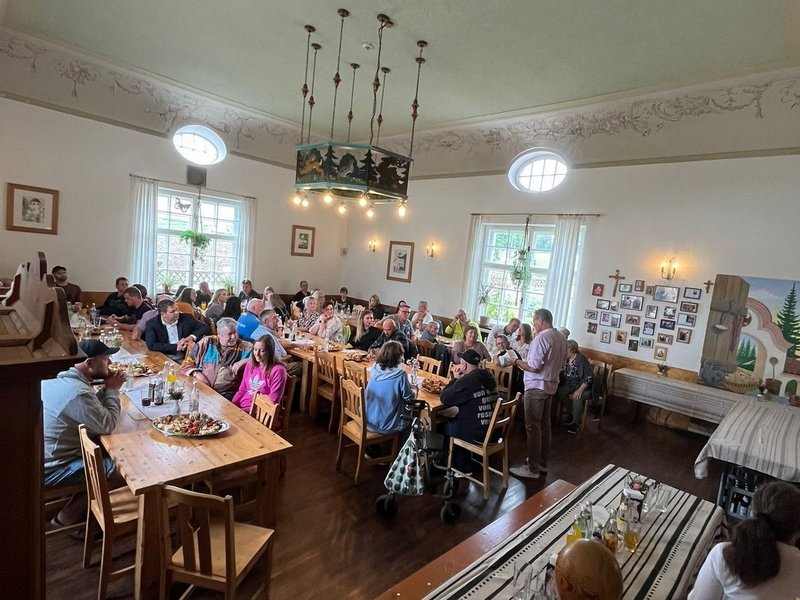 Wegen des regnerischen Wetters wurde das Fest kurzerhand in den Speisesaal verlegt – der guten Stimmung tat das keinen Abbruch. Eingeladen hatte Hausleiter Manfred Forstner, und viele Wegbegleiter/-innen, Kooperationspartner/-innen und Freunde des Hauses waren gekommen: darunter der Bürgermeister der Stadt Landau, Vertreter/-innen von Kliniken und Einrichtungen anderer Träger, Bewohnende und Mitarbeitende aus den Schwesterhäusern Talbach und Waldherr, eine große Abordnung des Kreuzbundes aus den Landkreisen Dingolfing und Traunstein sowie einige Leitungskolleg/-innen.