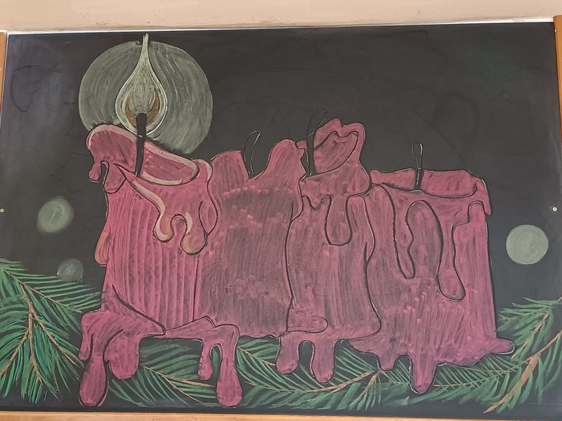 Einer unserer Bewohner hat wieder zur Kreide gegriffen und uns allen ein Adventsgesteck auf die Tafel gezaubert – ganz ohne Nadeln, Wachs und natürlich absolut brandschutzkonform.