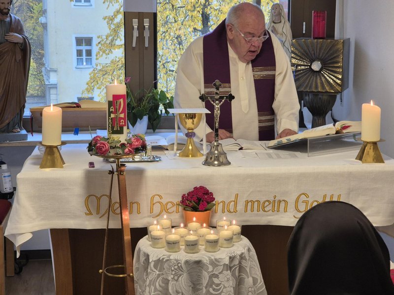 Der Höhepunkt der Feier war das feierliche Totengedenken. Bei der Verlesung der Namen unserer verstorbenen Bewohnerinnen und Bewohner wurde für jede/-n Einzelne/-n eine Kerze entzündet. Dieses Ritual schuf einen Moment der stillen Verbundenheit und zeigte, dass die Erinnerung an sie in unserer Gemeinschaft lebendig bleibt. Wir danken Pater Walter Orth für die würdevolle Gestaltung dieser Feier und allen, die durch ihre Teilnahme und ihr stilles Gebet dazu beigetragen haben, diesen Tag zu einem tröstlichen und besinnlichen Ereignis zu machen. Herr, gib allen Verstorbenen die ewige Ruhe. Wir sind dankbar für die Zeit, die wir mit ihnen verbringen durften, und halten ihr Andenken in Ehren.