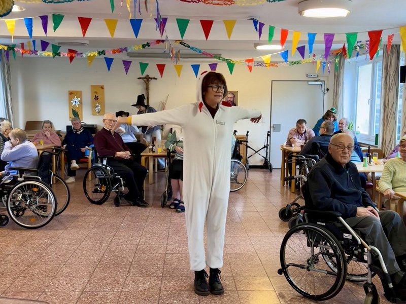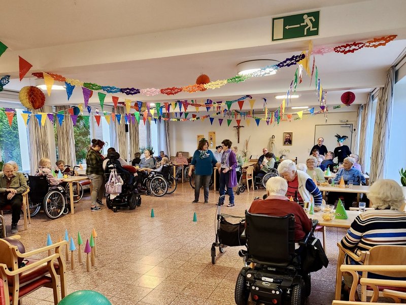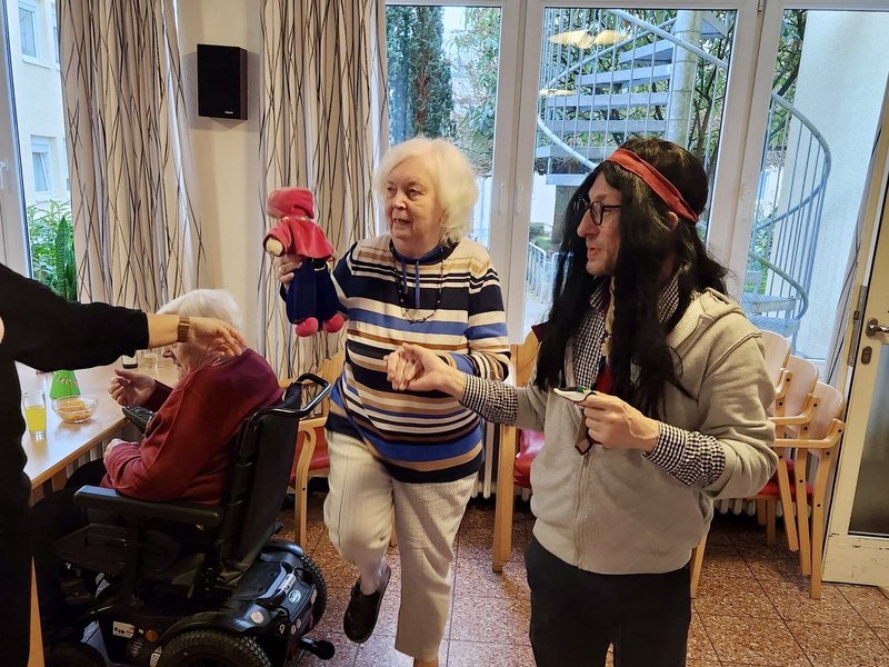 Auch das Tanzbein wurde geschwungen: Ob Walzer, Schunkeln oder einfach ein paar fröhliche Schritte zur Karnevalsmusik – die Freude an der Bewegung stand im Mittelpunkt. Unsere Bewohnerinnen und Bewohner bewiesen einmal mehr, dass Tanzen keine Frage des Alters ist.