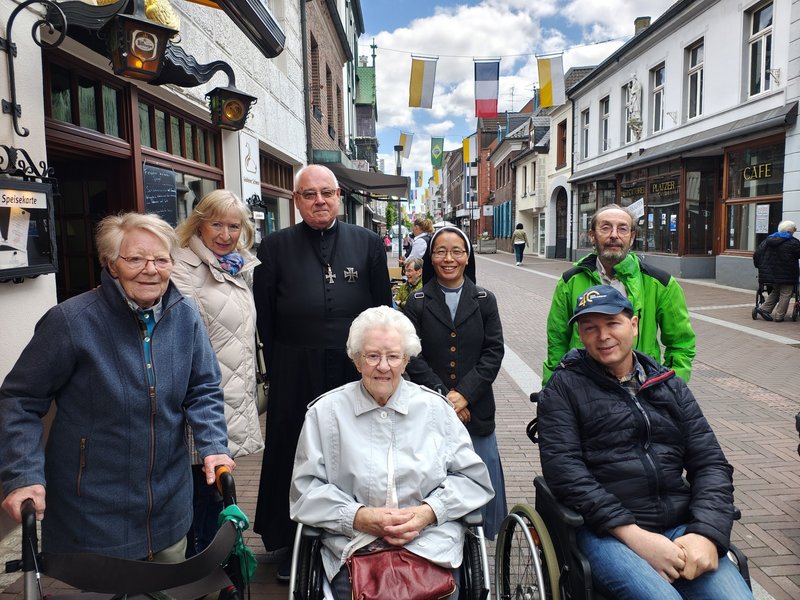 Zum Auftakt der Wallfahrtssaison Anfang Mai lud Frater Karl die Bewohnerinnen und Bewohner von St. Raphael zu einer Tagesfahrt nach Kevelaer ein. Gemeinsam mit den Mitarbeiterinnen Frau Weyer-Dorscheid und Sr. Josephine, den Ehrenamtlichen Frau Bosten, Frau Eschweiler und Herrn Meeßen sowie Pater Maneesh machten wir uns auf den Weg in den beliebten Wallfahrtsort.