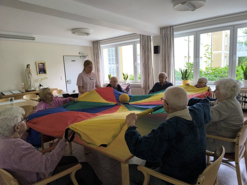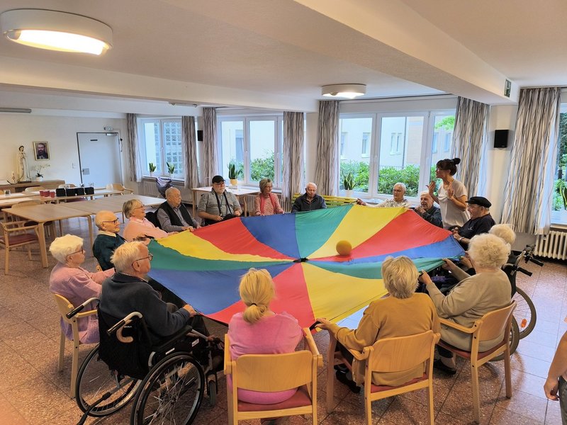Das triste Wetter hinderte aber weder Bewohner/-innen noch Gäste daran, gemeinsam bei Sport und Fitness viel Spaß zu haben. Der aufgebaute Parkour mit Bällen, Schwungtuch, Tisch-Krocket, Luftballon-Klatschen und Klettdartscheibe versprach Bewegung und Vergnügen. Wir wechselten immer wieder die Plätze. Besonders viel Spaß hatten alle beim gegenseitigen Luftballonzuspielen - nur mit Fliegenklatschen, was zudem alle zum Schwitzen brachte. Das Miteinander und der Spaß standen bei der Bankbegegnung im Vordergrund. Anfängliche Skepsis beispielsweise von Herrn R. „Wie, ich soll spielen?“, verflog sehr schnell, als er merkte, dass die Aufgaben richtig Spaß machten, aber auch schwierig waren. Einen Tischtennisball in einen kleinen Behälter zu werfen, ist nicht ganz ohne. Alle Mitspielenden stellten fest, dass die anderen es auch nicht besser konnten und trotzdem alle miteinander viel Spaß hatten. Zum Abschluß der sportlichen Bankbegegnung versuchten wir uns am Schwungtuch: einen Ball im Uhrzeigersinn über das Schwungtuch laufen lassen oder gemeinsam Schwung holen, um den Ball hoch in die Luft zu werfen. Gar nicht so einfach! Nach einer Stunde Sport, Spiele-Spaß und Fitness war die ordentliche Begegnung auf der Bank schon wieder vorbei.