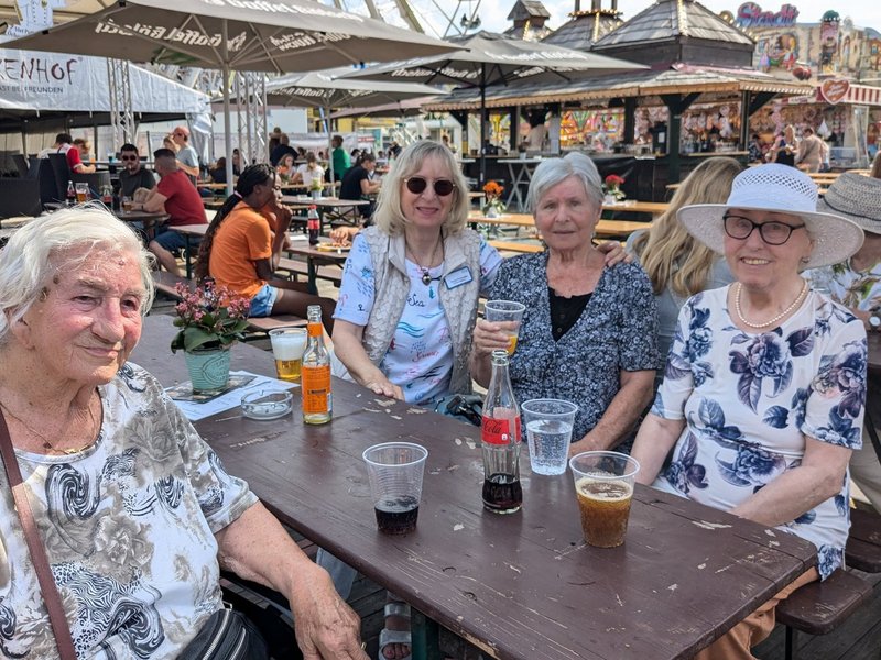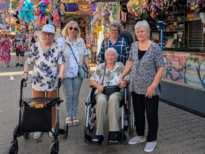 Nachdem die Wetterverhältnisse endlich angemessen waren für einen Kirmesbesuch, startete eine kleine Gruppe von Bewohner/-innen mit ihren beiden Begleiterinnen zu einer Runde über den Öcher Bend. Überall ertönte Musik aus den Lautsprechern, bunte Lichter flackerten und es roch angenehm nach gebrannten Mandeln, Popcorn oder Currywurst.