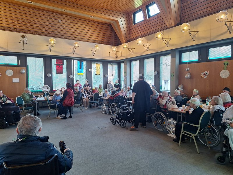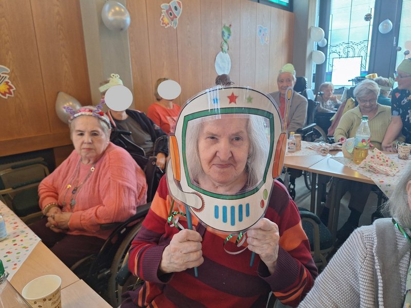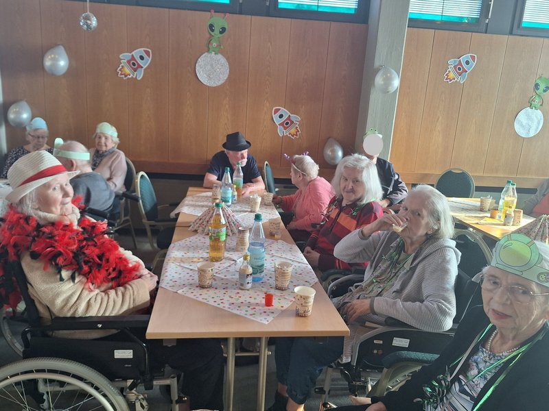 Bei unserer Karnevalsfeier am 26. Februar ging es außergalaktisch zu: Alle Bewohnerinnen und Bewohner trafen sich unter dem Motto "Außerirdische aus dem Weltall". Dazu wurde der Konferenzraum zur Raumstation umdekoriert. Dank der trotzdem vorhandenen Schwerkraft konnten alle genüsslich Kaffee trinken und leckere Teilchen verzehren, auch mit dem ein oder anderen Likörchen wurde angestoßen. Ein Highlight war der "Tanz der Außerirdischen", den der Soziale Dienst aufführte. Im Anschluss gab es kein Halten mehr: Es wurde getanzt, geschunkelt und auch die klassische Polonaise bei ausgelassener Stimmung durfte nicht fehlen. Als schöne Erinnerung konnte jeder ein Foto als Astronaut aus dem Weltall von sich knipsen lassen.