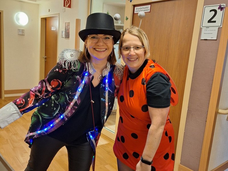 Am 27. Februar ging es hoch her beim Altweiberfasching. Für die passende Stimmung sorgten Karnevalslieder: Es wurde gemeinsam angestoßen, gesungen, geschunkelt und getanzt. Unsere Mitarbeiterinnen Heike (Küche) und Frau Coenen (Verwaltung) sorgten in Kostümen verkleidet und mit lauter Musik dafür, dass sich die gute Stimmung in allen Wohnbereichen verbreitete - mit Riesenerfolg!