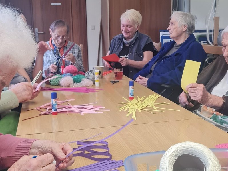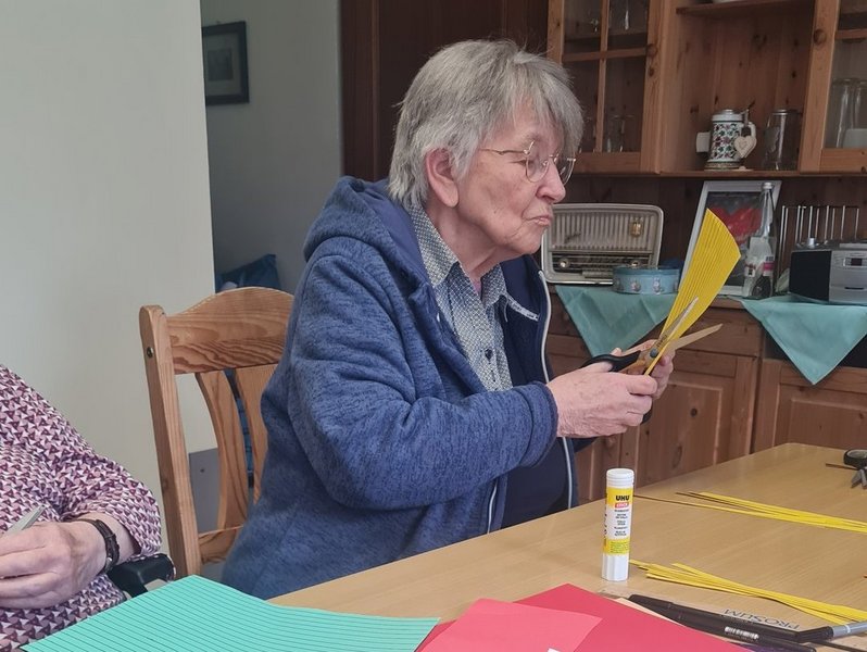 Geschick und Kreativität zeigen die Seniorinnen und Senioren aus dem Haus St. Michael: Sie basteln Fenster Blumen, um die Räumlichkeiten im Hause zum Blühen zu bringen.