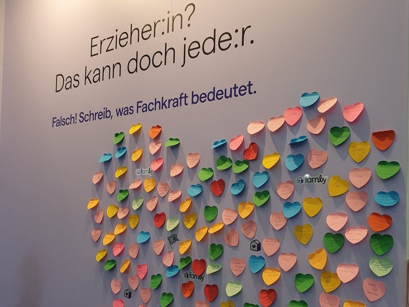 Besonders schön war eine Aktion, bei der Besucher/-innen auf kleine Herz-Zettel schreiben konnten, was eine pädagogische Fachkraft ausmacht. Aus vielen bunten Gedanken entstand ein großes Herz – mit Begriffen wie Empathie, Geduld, Vertrauen und Unterstützung. Werte, die auch unsere tägliche Arbeit prägen.