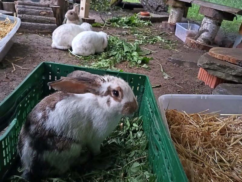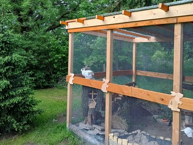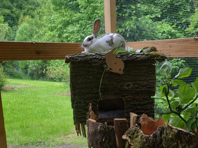 Nach knapp sechs Monaten Planung, Bau und liebevoller Gestaltung ist unser Außengehege für die Kaninchen nun endlich fertiggestellt. Mit viel Engagement und Herzblut haben wir einen artgerechten, sicheren und abwechslungsreichen Lebensraum aufgebaut, in dem sich unsere fünf Kaninchen – Bino, Elli, Hasi, Barabonka und Tomate allias Krümel – rundum wohlfühlen. Schon nach kurzer Zeit konnten wir beobachten, wie neugierig sie ihre neue Umgebung erkunden und die verschiedenen Versteckmöglichkeiten nutzen. Wir sind begeistert, wie gut sie sich eingelebt haben und wie viel Lebensfreude sie in ihrem neuen Zuhause zeigen.