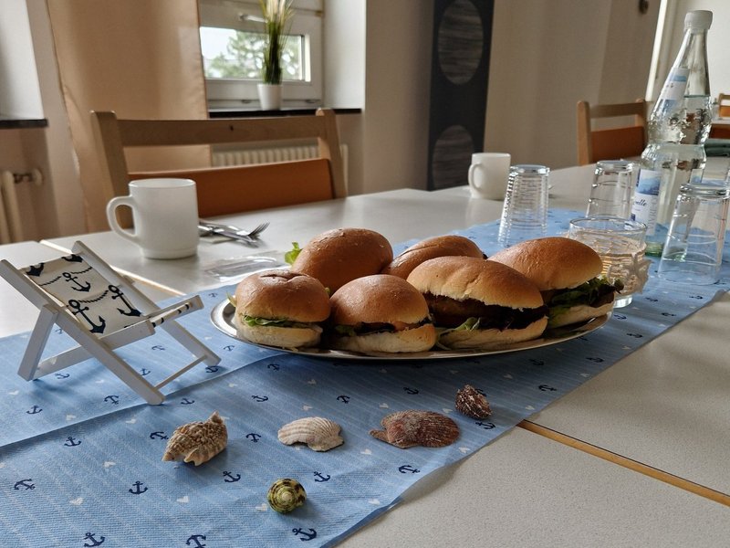 Zum Einstieg in die Urlaubswoche verwöhnten wir alle mit Fischbrötchen, damit war der Geschmackssinn bereits auf Urlaub an der See eingestellt. Natürlich durfte die passende Dekoration nicht fehlen, die mit Hilfe der Bewohner/-innen liebevoll gestaltet und bemalt wurde: Viele bunte Fische.