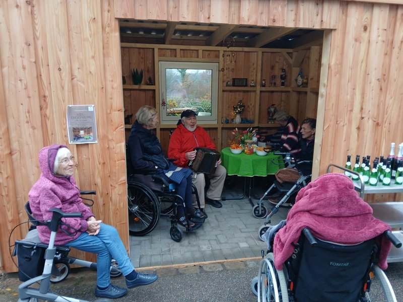 Bei Raucherhütten denkt man vielleicht im ersten Moment an einen Verschlag, der an eine verlassene Bushaltestelle erinnert: zugig, ungemütlich und wenig einladend. Die neu gebaute Raucherhütte beim St. Anna sollte anders werden – vielmehr wollten sich Bewohnerinnen einbringen, die Hütte liebevoll zu gestalten, ihr Flair zu verleihen und sie zu einem freundlichen Ort der Begegnung zu machen. Dies gelang durch vielerlei Dekorationsmaterialien und die warme Farbe des Holzes. Mit ein paar Snacks, Sekt und Musik haben wir unsere Hütte gebührend eingeweiht. Unsere Einrichtungsleitung Marco Sievert und die Vorsitzende unseres Heimbeirates Frau Jürgensen fanden launige und wertschätzende Worte für das Engagement der Bewohnerinnen. Die Tradition wollen wir fortführen, indem wir nun regelmäßig Begegnungen bei der Hütte schaffen, um sie zu einem Ort des Austausches, der Musik und des Zusammenfindens zu machen.