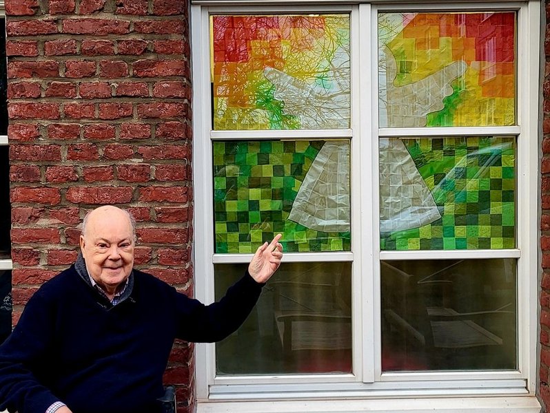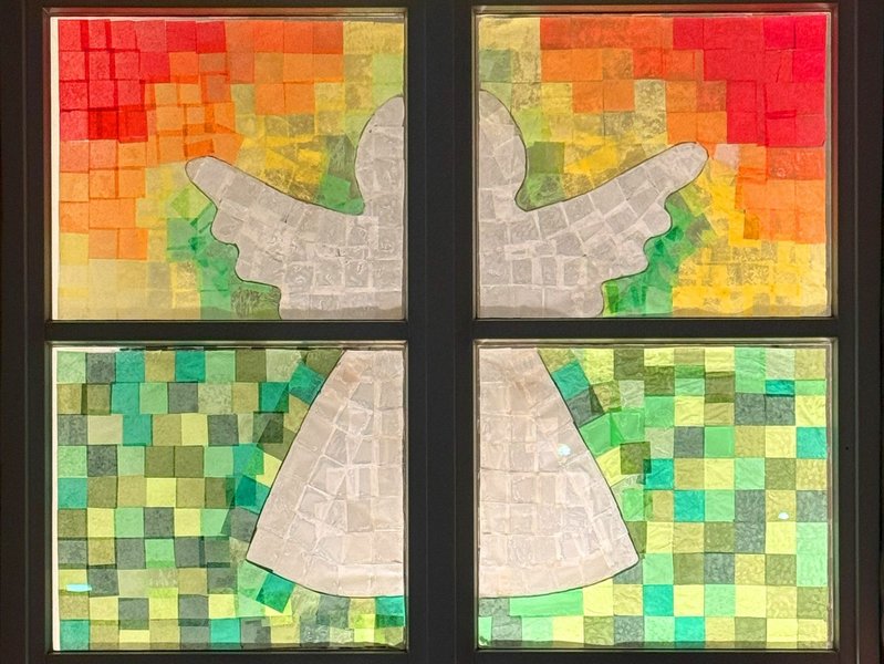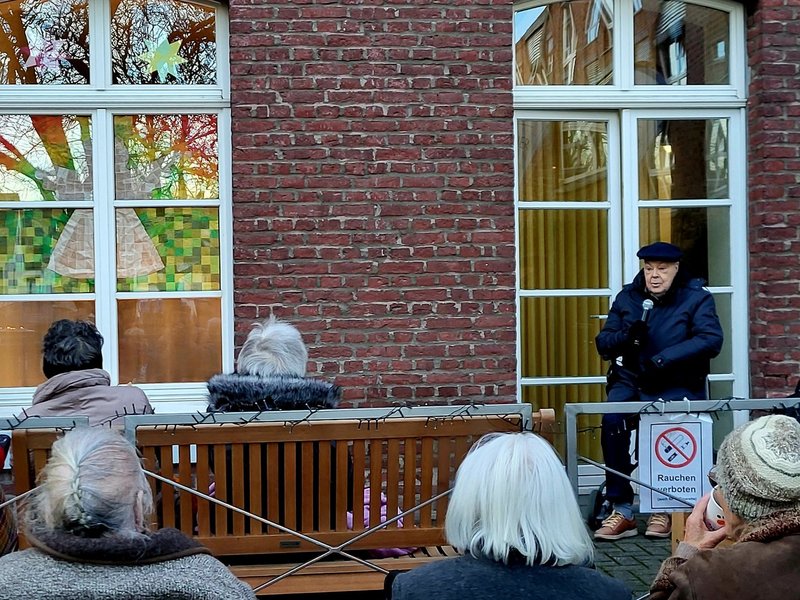 Mit diesem Eröffnungstext von Margit Umbach starteten die Bewohner/-innen und Gäste vor St. Raphael in den 1. Advent. Dort gibt es ein großes Sprossenfenster mit Engelmotiv zu bestaunen, kreiert auf der Basis einer Excelvorlage von unserem Bewohner Herr Orth. Sozialdienstmitarbeiterin Uli Weyer-Dorscheid hatte die Idee, in Anlehnung an den hl. Raphael, das Fenster mit einem Engelbild zu gestalten. Gesagt, getan. Und so schaffte es unsere geschickte Alltagsbegleiterin Andrea Müller in vielen Stunden gemeinsamer Bastelarbeit mit den Bewohner/-innen, einen wunderschönen Himmelsboten in „Pixel-Design“ anzufertigen, der herrlich leuchtet und ausgiebig bewundert wurde.