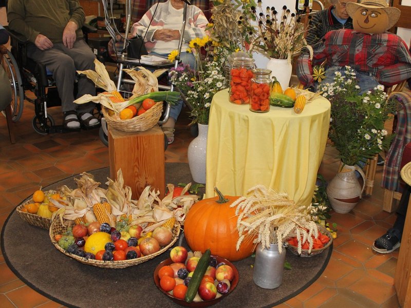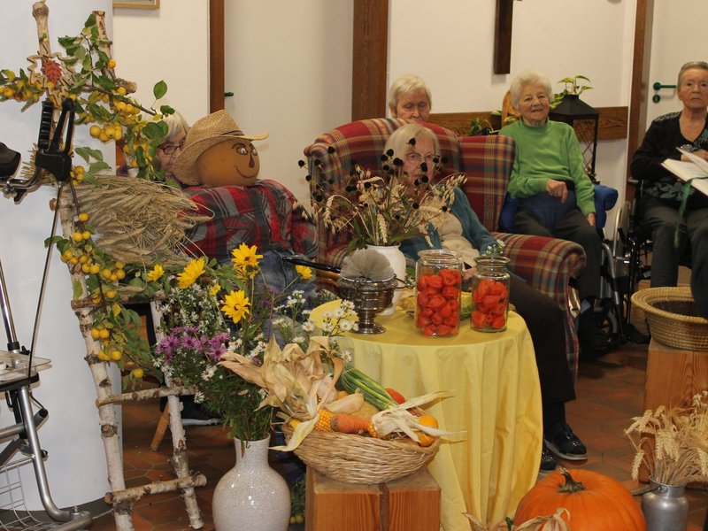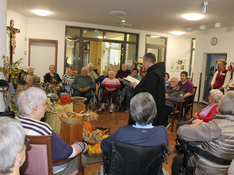 Am 9.10 wurde im Haus St. Hildegard das Erntedankfest gefeiert. Die Mitarbeiter des sozialen Dienstes im Haus sorgten für einen wundervoll dekorierten Eingangsbereich, indem die Erntedankgaben aufgestellt wurden. Um diesen Erntedanktisch herum feierten die Bewohner die diesjährige Erntedankfeier. Zuerst wurden Geschichten erzählt über den Hintergrund dieses Festes, es wurde gesungen und geprießen. Anschließend segnete der Pater die reichhaltige Ernte diesen Jahres. Auch für das leibliche Wohl wurde bestens gesorgt : Es gab leckeren Zwiebelkuchen und roten und weißen Suser dazu. Ein wunderschönes Erntedankfest 2025!