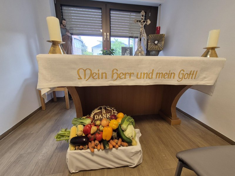 Am Sonntag feierte das Haus Maria vom Karmel traditionsgemäß das Erntedankfest - ein Tag voller Freude, Besinnung und gelebter Gemeinschaft, der Bewohnende, Angehörige und Mitarbeitende in besonderer Weise zusammenbrachte. Den feierlichen Höhepunkt des Tages bildete der Gottesdienst um 10 Uhr, den Pater Walter Orth in unserer festlich geschmückten Kapelle zelebrierte. In der Mitte, vor dem Altar stand eine prachtvolle Darstellung der Erntegaben: Bunte Kürbisse, frisches Obst, Gemüse und duftendes Brot symbolisierten die Fülle der Natur und erinnerten uns an all das, was wir im vergangenen Jahr empfangen durften. Im Rahmen des Gottesdienstes segnete Pater Orth die Ernte und erinnerte an die Bedeutung von Dankbarkeit und Achtsamkeit.