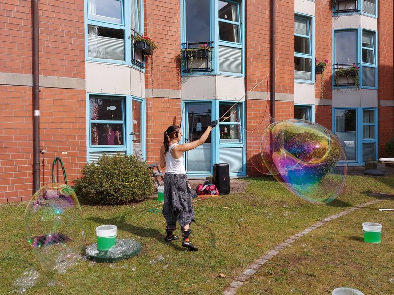 Im Anschluss wohnten wir dann der Eröffnungsshow von Nadine bei, die uns zeigte, wie große Seifenblasen gemacht werden und im Anschluss alle anleitete mal eigene Seifenblasen zu machen, sodass die Bewohnerinnen und Bewohner zum Beispiel bunte Sterne zu Gesicht bekamen. Derweil baute schon die Swing Band „Luck-Up“ auf, die dann zum Beginn des Grillens mit ihrer Musik einsetzte.