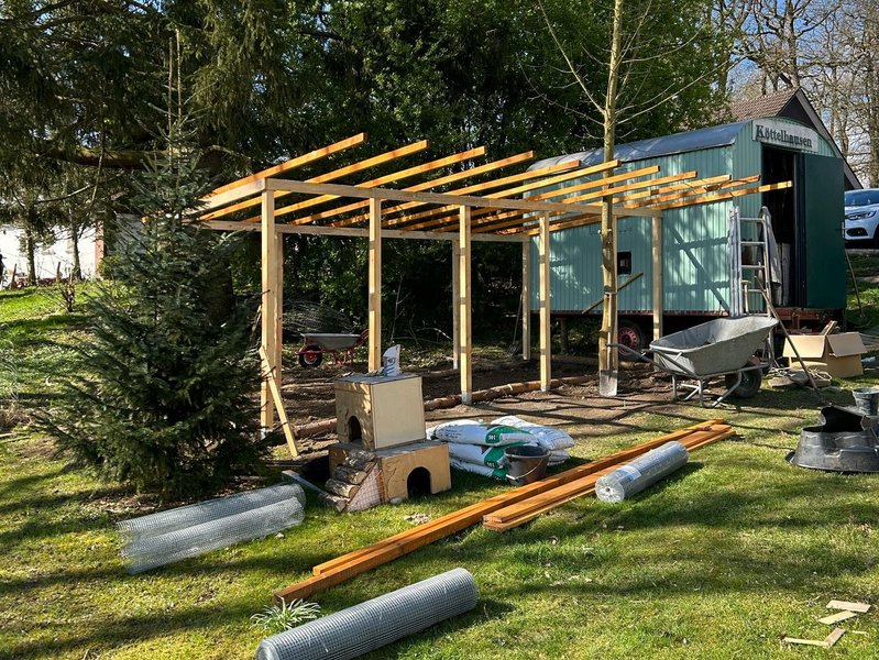 Der Ausbau des Kaninchen-Außengeheges nimmt langsam, aber sicher Form an und macht gute Fortschritte - bald können wir die kleinen Hoppelmänner fast schon in ihre neue Luxuswohnung einziehen lassen. Bino und Elli, die beiden Baustellen-Inspektoren, warten gespannt und haben den Fortschritt fest im Blick. Ganz schön professionell, die beiden.