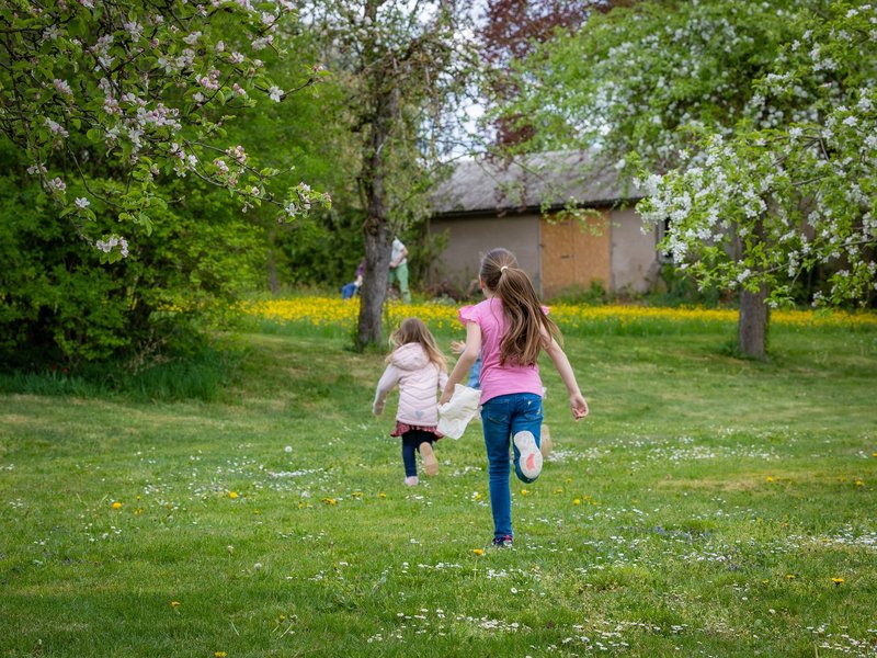 Die Erwachsenen unterstützten die Kleineren oder entspannten sich mit den Bewohnerinnen und Bewohnern auf der neu möblierten Terrasse. Bei Kaffee und Kuchen genossen alle das frühlingshafte Wetter und beobachteten das lebhafte Treiben. Es war ein herrlicher Nachmittag voller Lachen und Leben im Schloss.