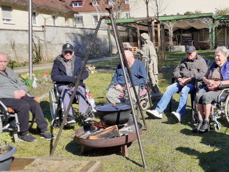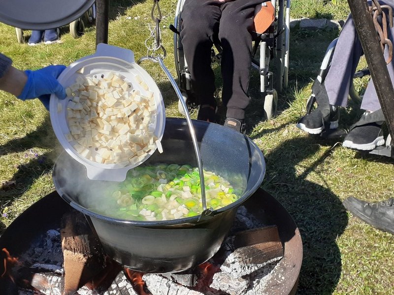 Pünktlich zum Start des Frühlings bereiteten die Bewohnerinnen und Bewohner des Katharinenstifts gemeinsam eine Frühlingssuppe über dem Feuer zu. Am frühen Morgen startete eine kleine Gruppe von Bewohnenden zum Einkaufen auf den Markt, um Gemüse zu besorgen. Im Garten wurde währenddessen in der Feuerschale das Feuer entzündet, über dem die Suppe gekocht werden sollte. Während viele unserer Frauen in der Küche beim Schnippeln halfen, sorgten unserer Männer dafür, dass das Feuer ordentlich brannte und für genügend Hitze sorgte. Beim gemeinsamen Essen der Suppe in der Frühlingssonne waren sich alle einig: Man kann mit den einfachsten Mitteln oftmals die besten Gerichte kochen.