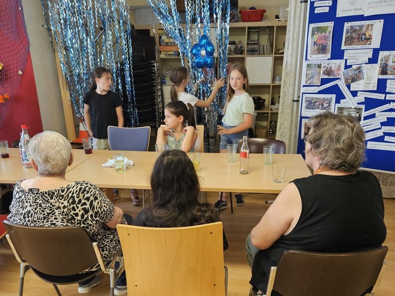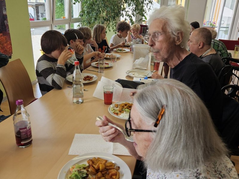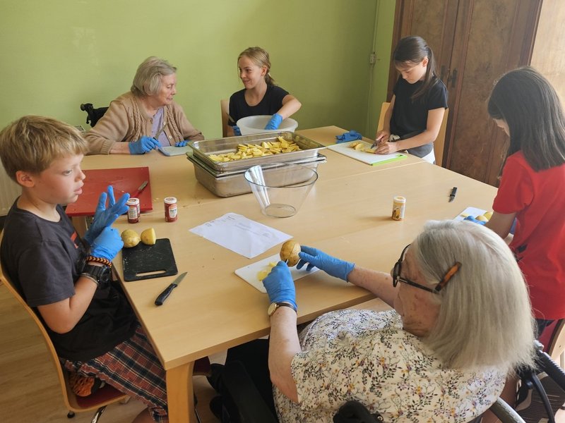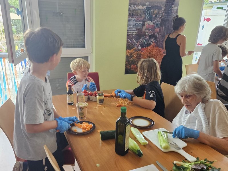 Die 4. Klasse unserer Nachbarschule "Karlschule" kochte mit 10 Bewohnerinnen und Bewohnern Backkartoffeln, Bibeliskäs und Salat sowie ein leckeres Dessert. Das Ziel, das Generationen aufeinander treffen, um Verständnis für die Lebenssituation des Anderen zu entwickeln, ist durchaus geglückt. Alle hatten viel Spaß bei der Zubereitung der Speisen und ließen sich die Köstlichkeiten bei einem gemeinsamen Essen schmecken.