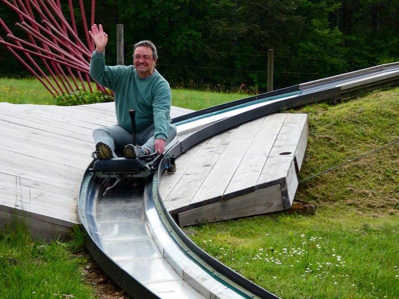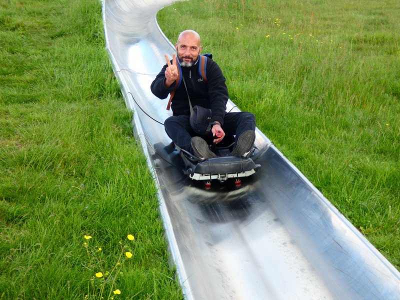 Mit bis zu 40 km/h sausten die Bewohner/-innen mit viel Spaß den Berg hinunter und anschließend konnte man sich mit dem automatischen Lift bequem wieder den Berg hinauf ziehen lassen.