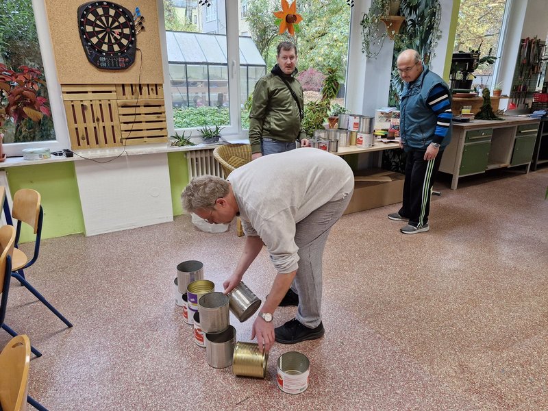 Die Aufgaben bestanden daraus, Dosen in die Höhe zu stapeln, einem Becher Pingpong Spiel, mit Steinen gezielt in eine Zielscheibe auf dem Boden zu werfen, pantomimisch Begriffe zu erklären, einen Parcour mit verbundenen Augen nur durch Anweisungen der Gruppe zu laufen und an der Tischtennisplatte Punkte gegen Mitarbeiter/-innen des Hauses zu erzielen.