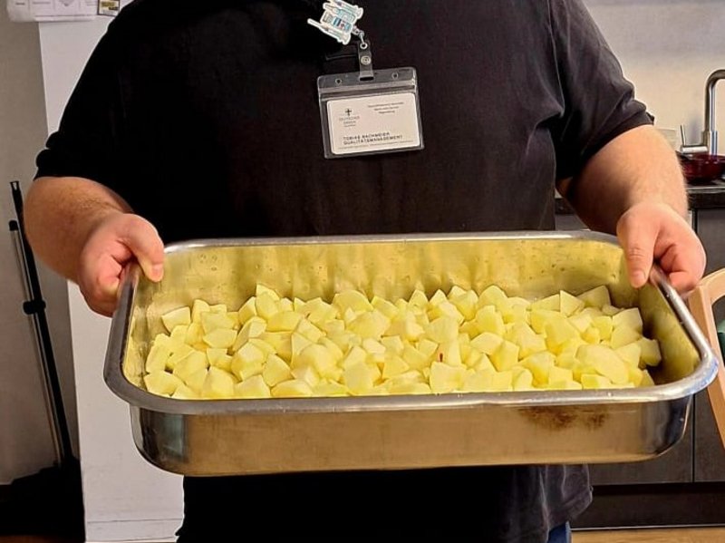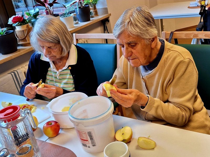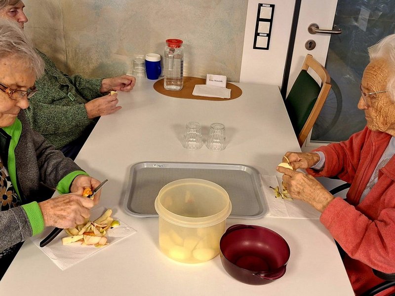 Bevor der Teig in die Form kann, steht das Apfelschälen auf dem Programm. Bewohnende und Mitarbeitende finden sich zusammen, um in geselliger Runde die Körbe voller knackiger Äpfel zu verarbeiten. Diese einfache Tätigkeit ist eine wertvolle Aktivierung, die die Feinmotorik fördert und zugleich die Möglichkeit für lockere Gespräche und das Erzählen alter Geschichten bietet. Schon das Kleinschneiden der Äpfel weckt bei vielen Bewohnenden Kindheitserinnerungen an die eigene Küche und Backstube.