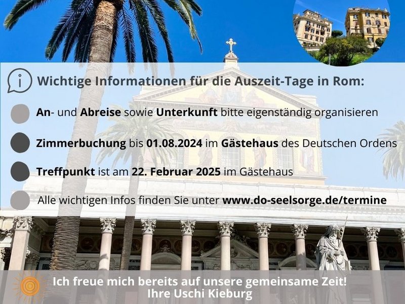 Vom 22. Februar bis 1. März 2025 möchte ich Sie ganz herzlich einladen, gemeinschaftlich ein paar Auszeit-Tage in Rom zu verbringen.