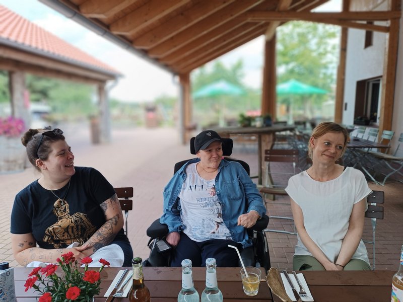 Die Bewohnerinnen und Bewohner der Jungen Pflege freuten sich, als sie nach der langen und teilweise regnerischen Anreise endlich in Bad Bevensen im Heidehotel ankamen. Das Wetter meinte es nach der Ankunft gut, sodass der Urlaub mit einem Grill-Buffet und Erfrischungsgetränk starten konnte.