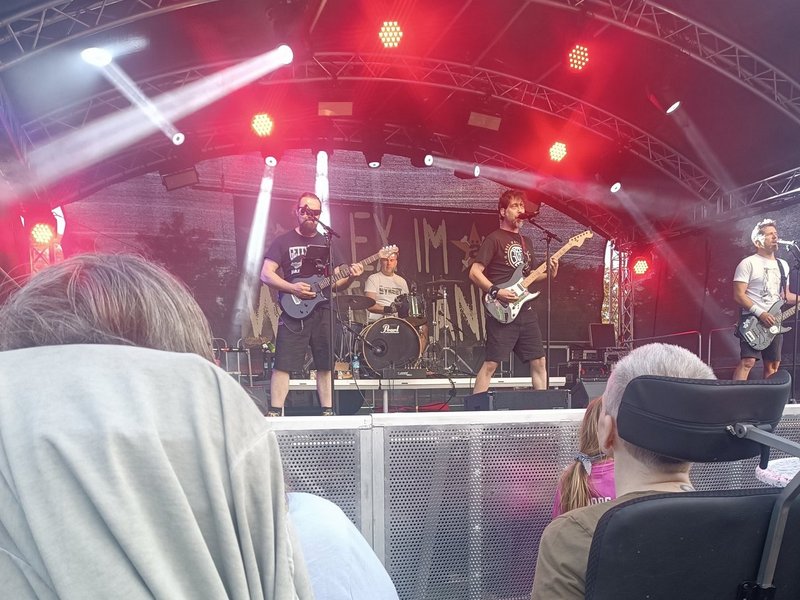 Der Freitagabend in der Obi-Arena war für sechs Bewohner/-innen aus unserer Jungen Pflege ein besonderes Highlight, denn sie waren zu Besuch bei "Sounds of Summer". Der Abend begann mit einer herzerwärmenden Geste: Michael Hinnah, einer unserer Bewohner, durfte die Ankündigungen der Tracks für die Band Kosmonovski übernehmen, bei der er selbst sechs Jahre lang "Ansager" war. Dabei kamen natürlich viele Erinnerungen hoch. Das siebenköpfige Kollektiv aus Rheine eröffnete das Konzert und sorgte mit ihrer frischen, tanzbaren, aber auch politischen Musik für gute Stimmung.