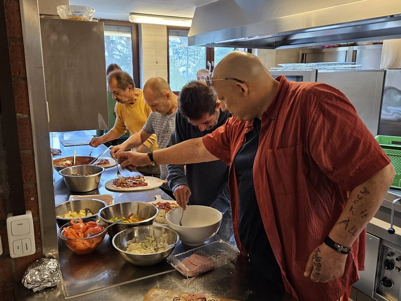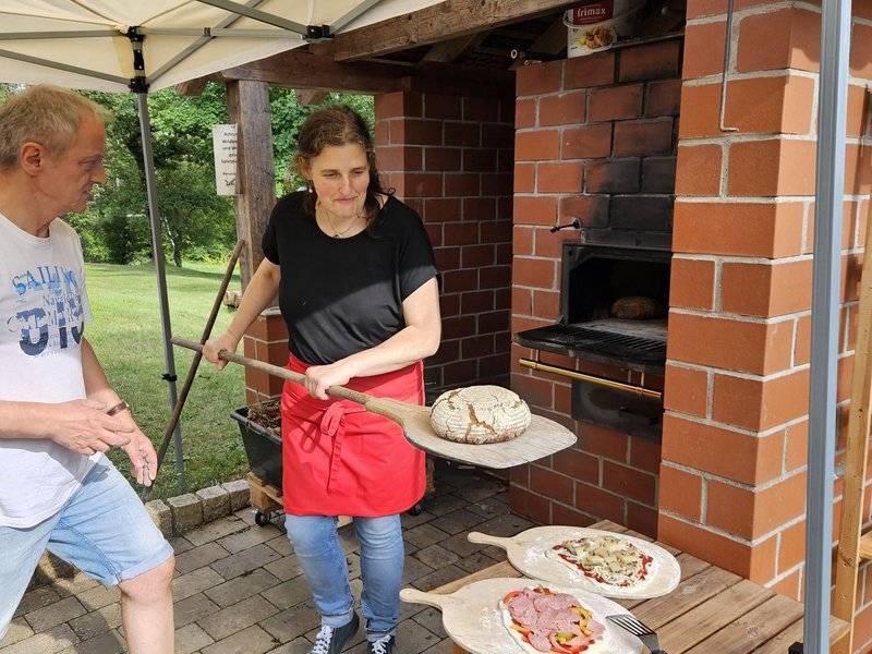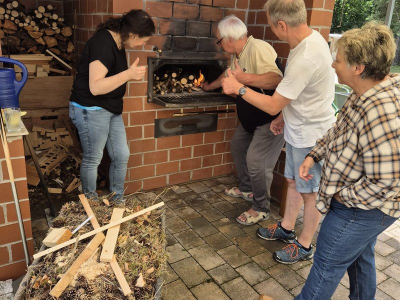 Ein Familienangehöriger einer Mitarbeiterin schenkte uns an einem Sonntag seine Zeit und sein Wissen: Er brachte selbst angesetzten Sauerteig mit, zeigte uns, wie man den Ofen richtig anfeuert, und leitete einen wunderbaren Backkurs. Nach dem Brotbacken durfte sich jeder seine eigene Pizza belegen – ein echtes Erlebnis für unsere Bewohnerinnen und Bewohner!