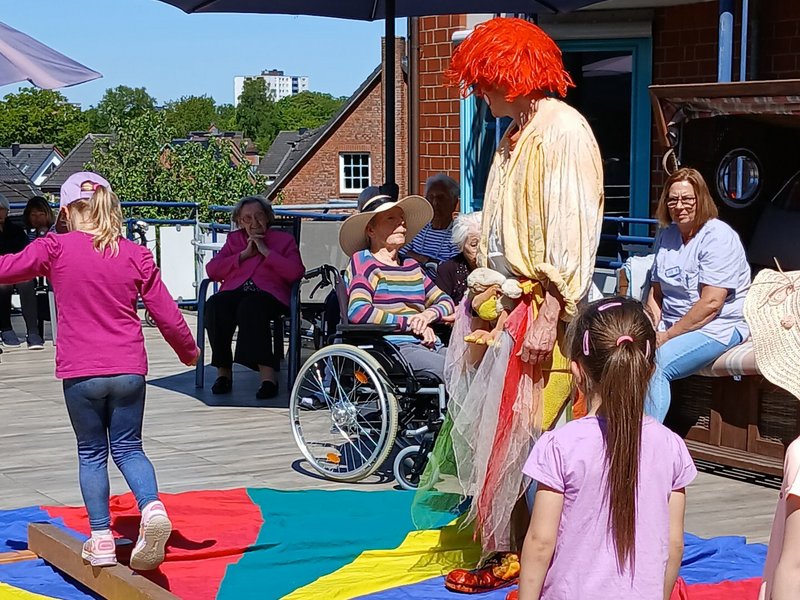 Leuchtende Augen, begeisterte Gesichter und eine Vorstellung der Extraklasse. Diese Kombination durften wir erleben, als uns die Kinder aus der DRK-Kita-Dorfstraße besuchten. Denn sie waren unserer Einladung gefolgt einen Vormittag bei uns im Haus mit einem Mitmach-Zirkus zu verbringen. Hula-Hup, balancieren und sogar eine eingeübte Nummer wurden vom Aktionsbüro „Delectatio“ in Person von Björn Geitmann angeleitet. So erlebten wir auf unserer wunderschönen Dachterrasse einen grandiosen Vormittag mit einer Vorstellung vor dem Mittagessen, die uns alle faszinierte! Dieses Format wurde uns durch die Volksbank-Stiftung ermöglicht, der wir für ihr Engagement unheimlich dankbar sind – was gibt es Schöneres als die Generationen zusammenzubringen und gemeinsam leuchtende Augen zu bekommen?