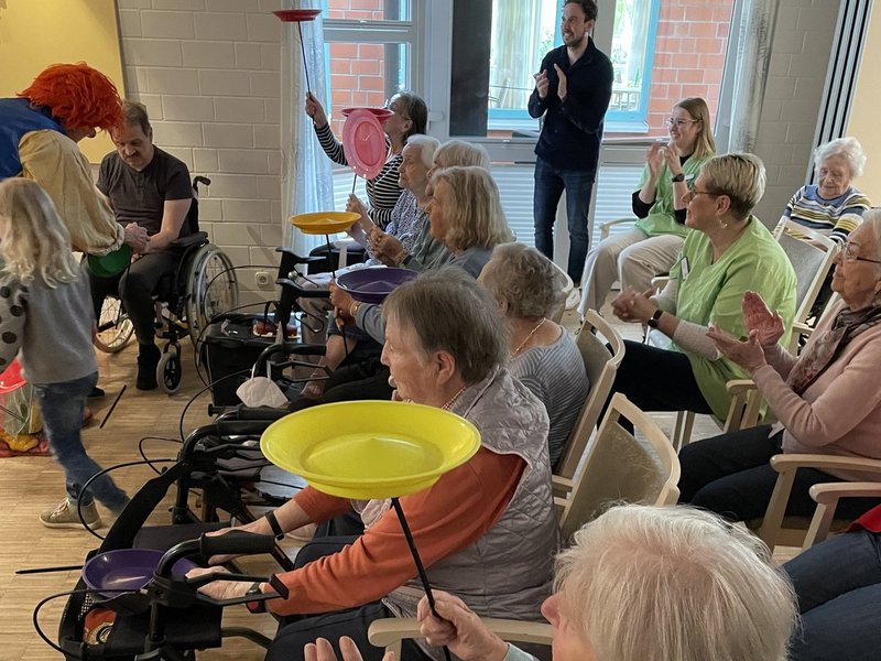 Leuchtende Augen bei allen Beteiligten – der Mitmach-Zirkus von „Delectatio“ hat im Haus St. Anna -Halt- gemacht und uns alle in seinen Bann gezogen. Der Clown „Öern“ begrüßte morgens eine Gruppe aus der DRK-Kita „Dorfstraße“ und fing an, Kunststücke mit den Kindern einzustudieren.
