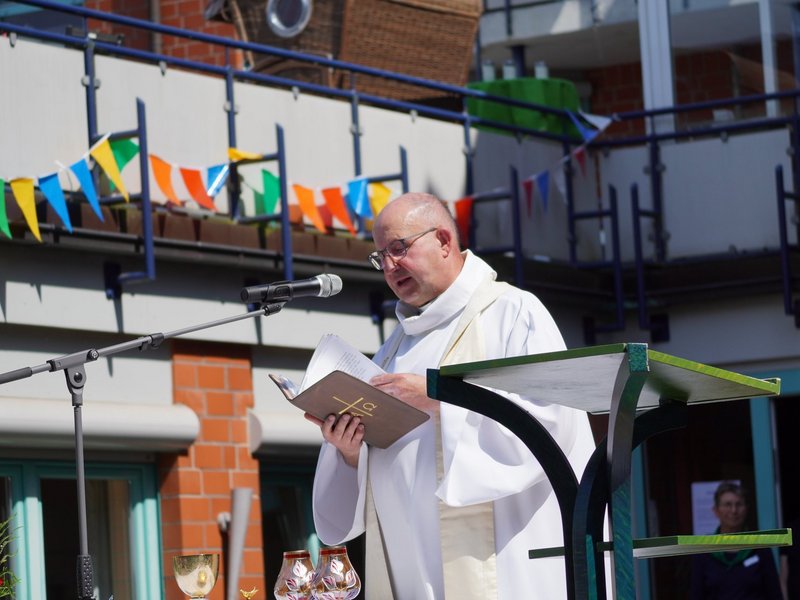 Die Sonne lacht – ein guter Start für unser Sommerfest! Die letzten Vorbereitungen liefen wie am Schnürchen und auch die Frage "Wo sind nochmal die Sonnenhüte?" konnte geklärt werden, so dass wir pünktlich um 11:00 Uhr mit dem Gottesdienst beginnen konnten. Pater Dieter betonte in seiner Predigt das Verbindende eines Sommerfestes, musikalisch begleitet vom Posaunenchor der Kirchengemeinde.