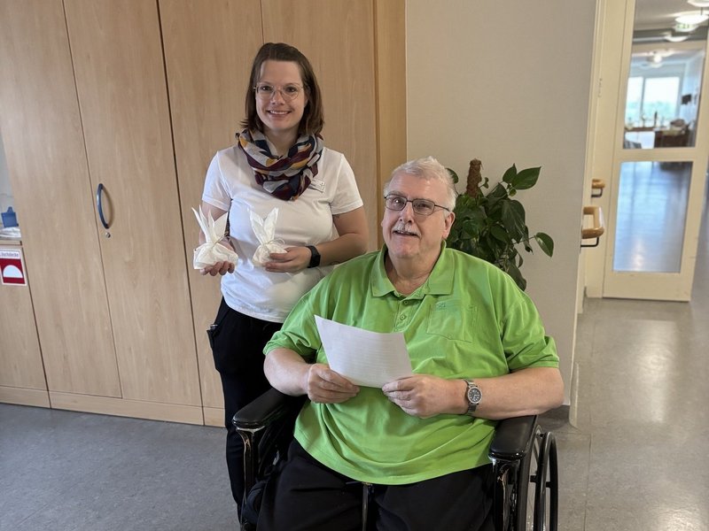 Doch auch an diejenigen, die aus gesundheitlichen Gründen nicht an den Veranstaltungen teilnehmen konnten, wurde gedacht: Paul Leusing, selbst Bewohner unseres Hauses, machte sich gemeinsam mit Frau Ahaus auf den Weg, um den Mitbewohnenden eine kleine Freude zu bereiten. Mit einem liebevoll überreichten Geschenk und einer vorgelesenen Ostergeschichte zauberten sie ein Lächeln in so manches Gesicht.