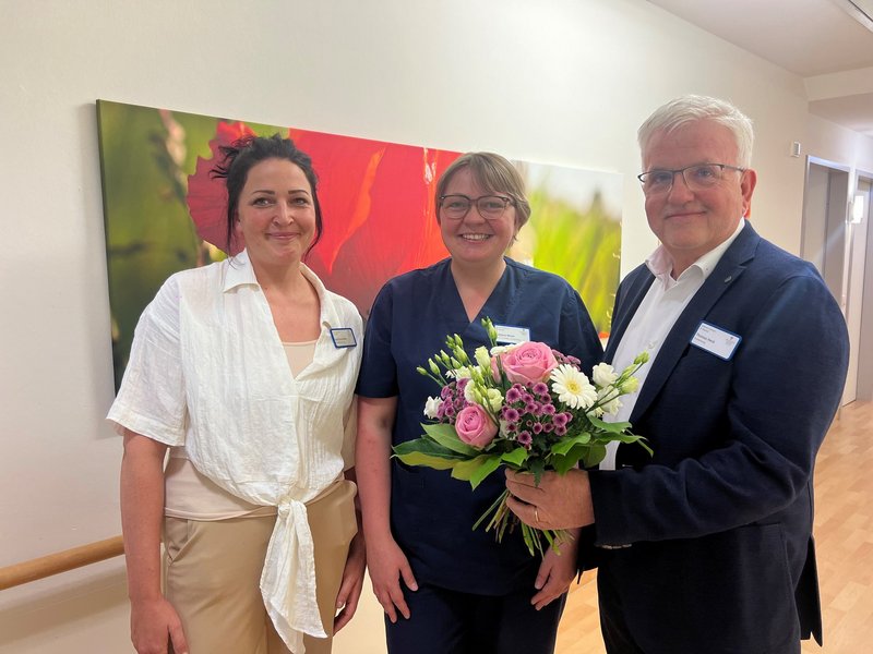 Sie gratulieren der stellvertretenden Wohnbereichsleitung Tatjana Moor mit einem Blumenstrauß zur bestandenen Palliativ Care Weiterbildung.