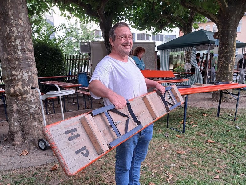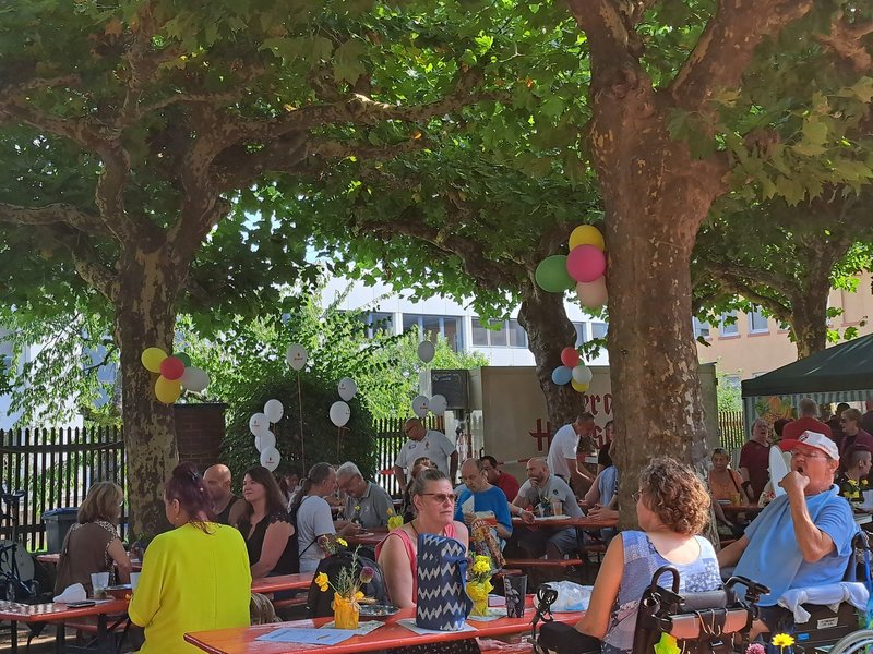 Einige unserer Klientinnen und Klienten stellten sich zur Verfügung einen Tag in Hanau zu verbringen: Am Morgen wurde der Aufbau der Bierzeltgarnituren und Pavillons des Festes vom Haus Noah übernommen. Den Nachmittag konnten wir bei guter Musik und Unterhaltung mitfeiern. Es gab viele Infostände und Aktionen im Therapiegarten.