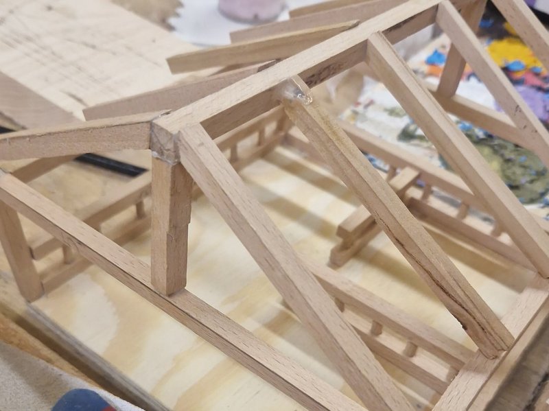 Samuel werkelt an einer Krippe/einem Gebäude.
