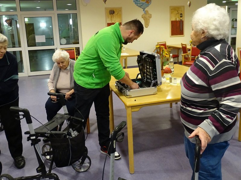Herr Kuhn aus dem Robert Fischer Orthopädie-Schuhtechnik Sanitätshaus hat den Bewohnerinnen und Bewohnern verschiedene Rollatoren vorgestellt und auf die jeweiligen Bedürfnisse eingestellt.