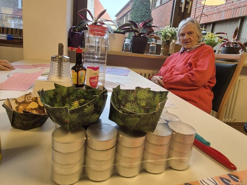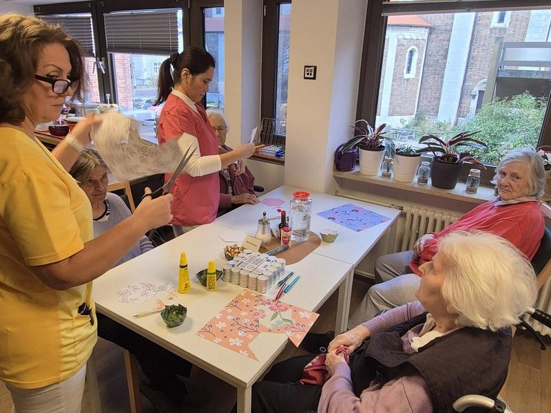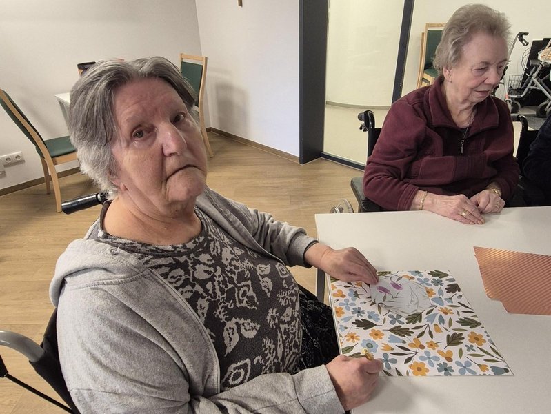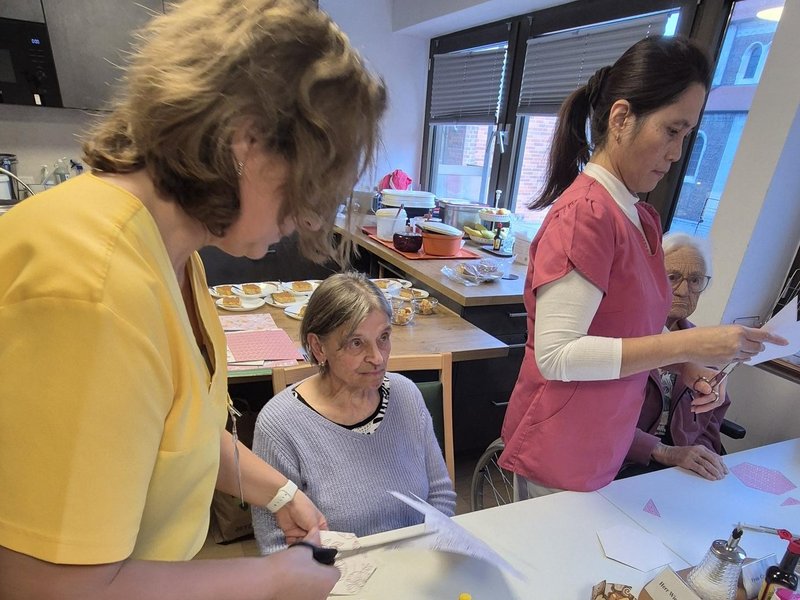 Der Tag begann mit einer besinnlichen, gemeinsamen Messe in der Hauskapelle. Im Mittelpunkt stand die Botschaft des Heiligen Martin, der mit seinem Mantel das Leben eines frierenden Bettlers rettete. Die Feier bot Raum für innere Einkehr und stärkte das Gefühl der Gemeinschaft. Anschließend versammelten sich die Teilnehmenden im Aufenthaltsraum: Fleißig wurden Sankt Martins Lichter gebastelt. Die Bewohnenden genossen es sichtlich, die bunten Lichter für den Abend vorzubereiten. Die liebevoll gestalteten Lichter schmückten später unsere Flure und sorgten für eine warme, festliche Atmosphäre.