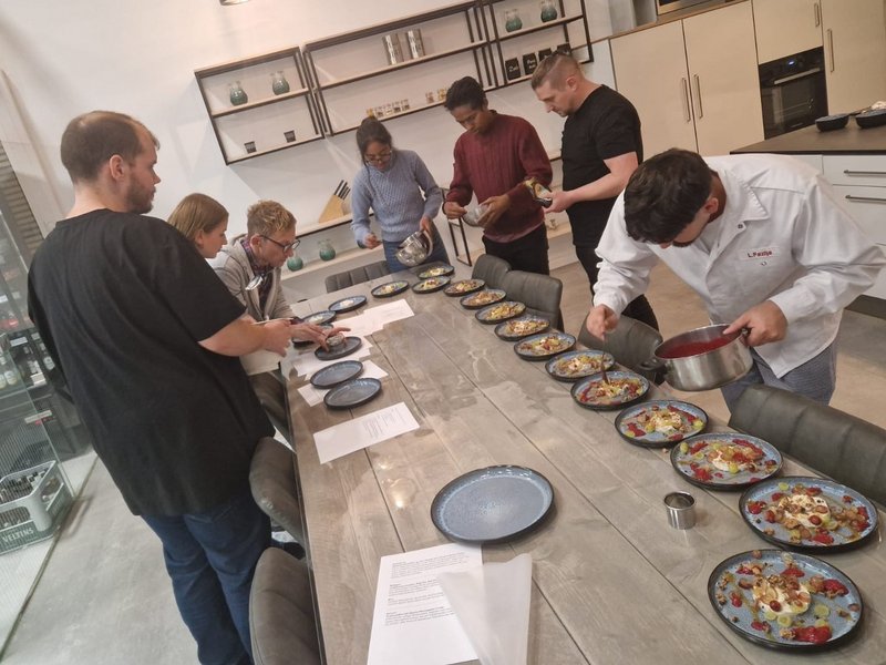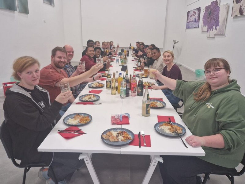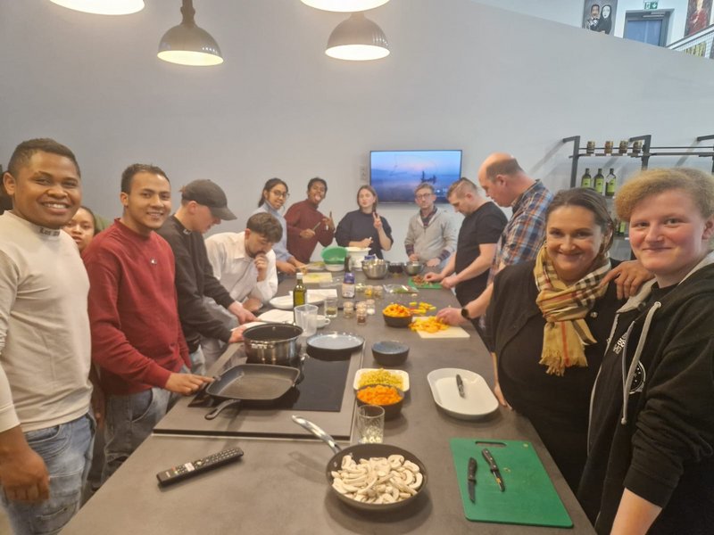Ziel des Tages war es, jungen Menschen die Möglichkeit zu geben, unsere Arbeit kennenzulernen, Fragen zu stellen und sich mit Bewohnern und Mitarbeitenden auszutauschen. Nach einer kurzen Einführung ging es direkt in die Praxis: Im Eventraum wurde gemeinsam gekocht! Die Schülerinnen und Schüler packten fleißig mit an, schnitten Gemüse, bereiteten leckere Gerichte zu und lernten dabei nicht nur kulinarische Tricks, sondern auch, wie wichtig Teamarbeit und Kommunikation sind.