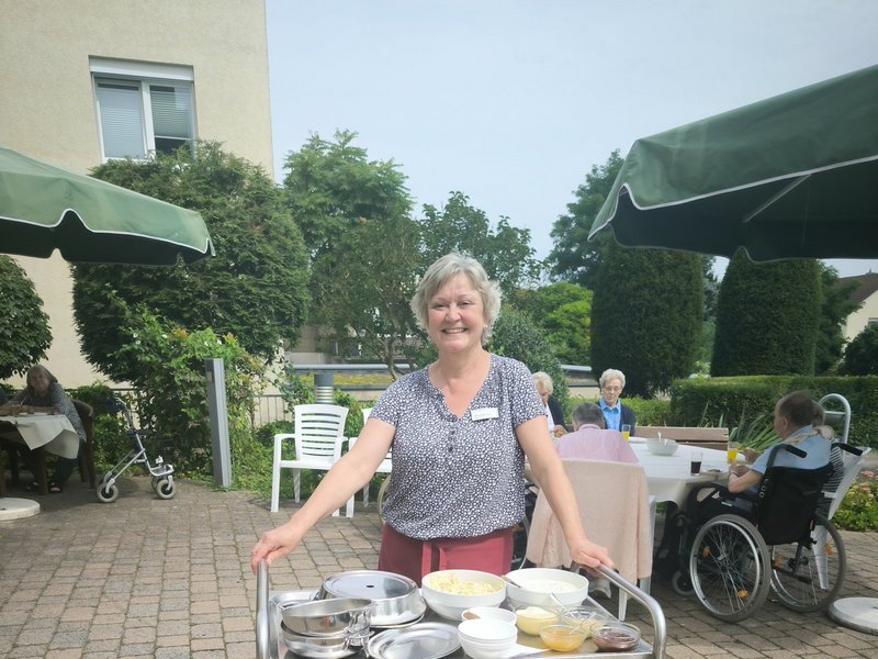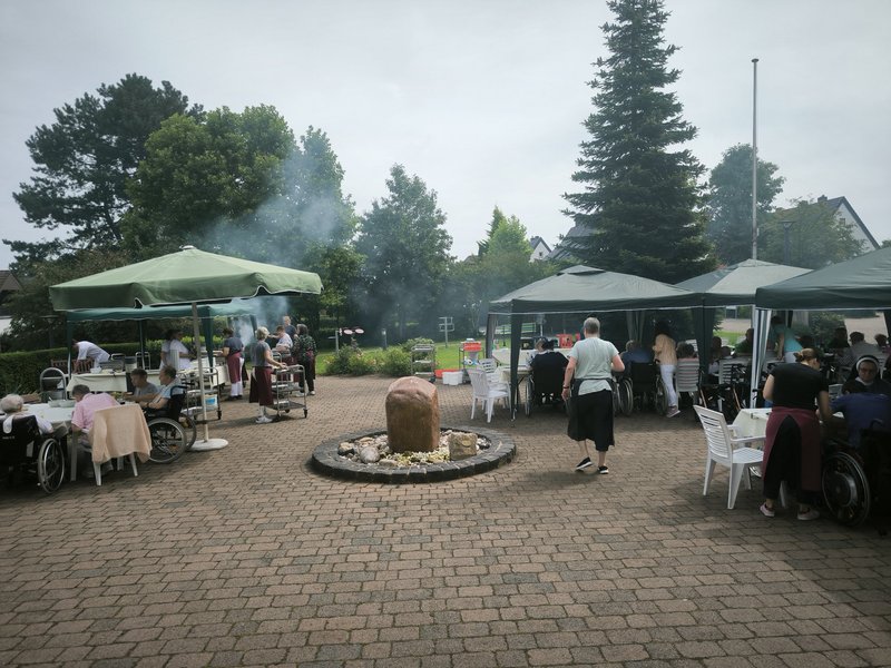 Darüber, dass der Sommer zurückkehrte, freuten sich unsere Bewohnerinnen und Bewohner wie auch wir. So war es möglich, ein spontanes Grillen auf die Beine zu stellen. Alle Teilnehmenden genossen sichtlich das gute Wetter, freuten sich über frisch gegrillte Bratwürstchen, Steaks und Bauchspeck. Natürlich fehlten auch die Kaltgetränke zu einem guten Grillen nicht.