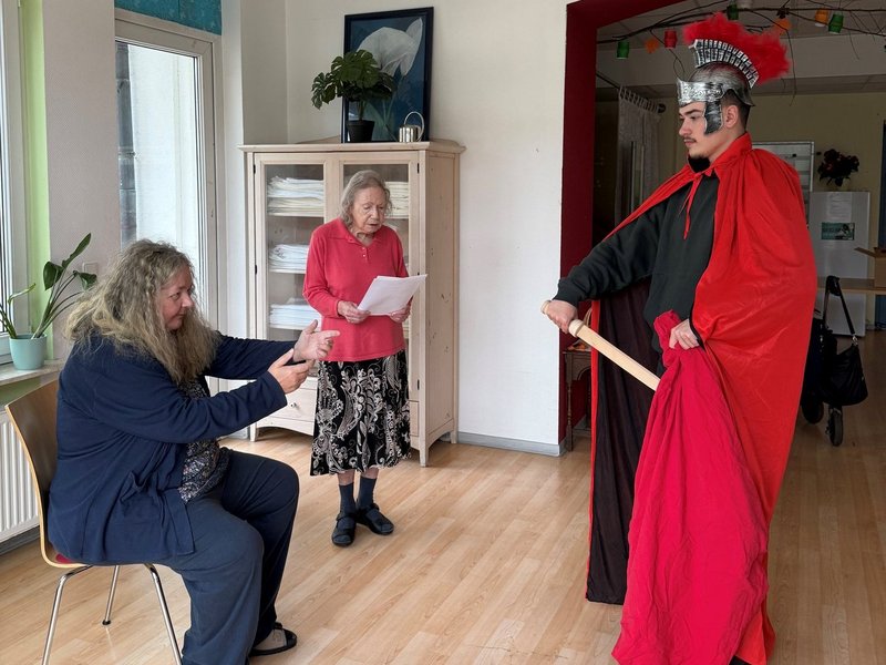 Nicht fehlen durfte auch - das bei uns im Haus bereits traditionelle - Schauspiel der Geschichte von St. Martin und der Mantelteilung, vorgeführt von einer Gruppe unserer Bewohnenden und kräftig unterstützt von unserem Kollegen im FSJ.