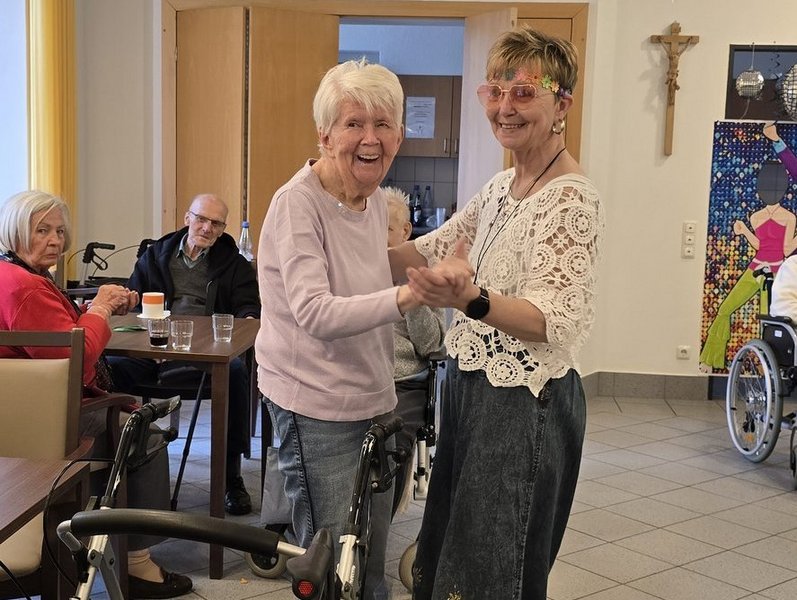 Schlaghose, Discokugel, Blumen im Haar – Seniorinnen und Senioren unserer Altenhilfe-Einrichtung in Aachen reisten zurück in die Zeit ihrer Jugend, schunkelten zu bekannten Schlagern und sangen aus tiefstem Herzen die Hits aus den 70er Jahren mit. Wer konnte, schwang das Tanzbein. Eine Zeitreise, die alle sehr berührte. Die Bewohnerinnen und Bewohner bedankten sich überschwänglich bei den Mitarbeitenden, die den Disconachmittag ermöglichten. Eines ist sicher: Die nächste Schlagerparty kommt bestimmt!
