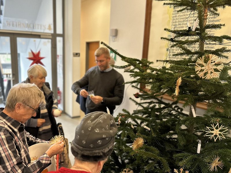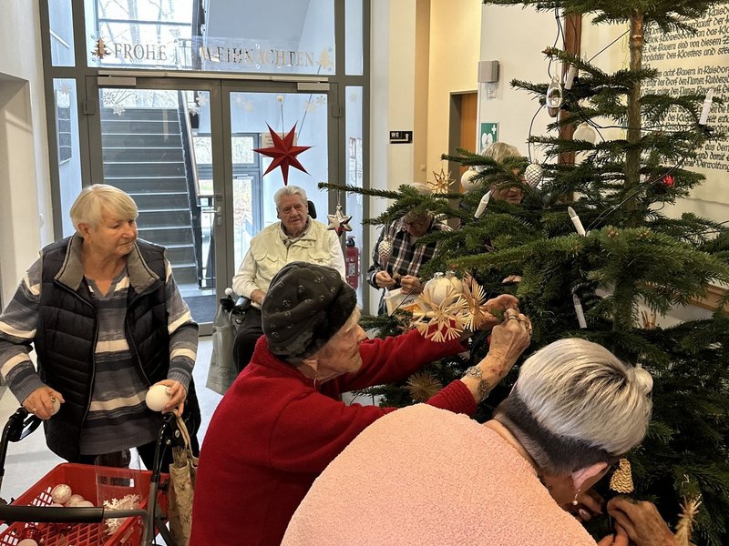 Ob Strohfiguren, weiße oder rote Kugeln, alle Elemente fanden ihren speziellen Platz. Dabei hängten die Bewohnerinnen und Bewohner diese entweder selbst auf oder wir folgten strikt ihren Anweisungen, sodass sich unser Einrichtungsleiter Marco Sievert schnell auf der Leiter wiederfand und auch die oberen Gefilde der Tanne mit dem Schmuck bedachte.