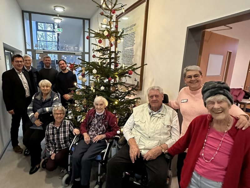 Und so hatten wir uns vom Team des Haus St. Anna sechs Bewohnerinnen und Bewohner ins Rathaus mitgenommen, um den Weihnachtsbaum im Foyer zu seinem Glanz zu verhelfen.