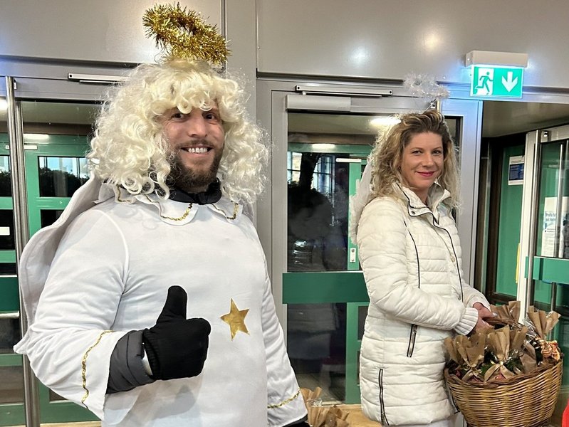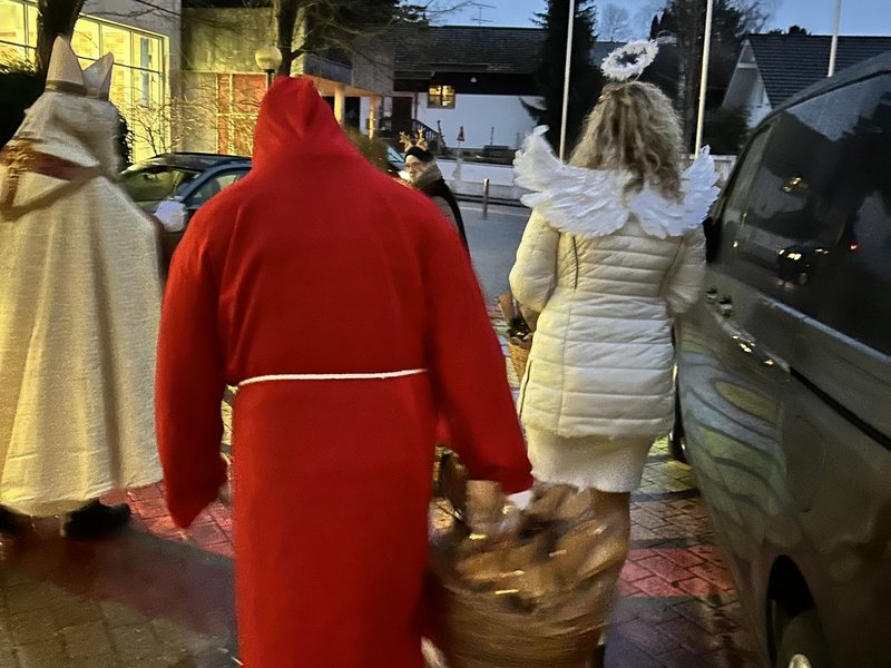Drei Rehabilitand/-innen unterstützten den Nikolaus beim Weihnachtsmarkt und sorgten für freudige Gesichter, als sie Geschenke an Kinder verteilten.