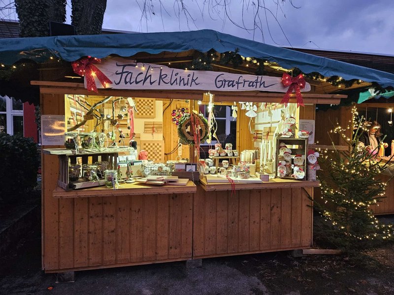 Auch 2024 nahmen wir wieder am Grafrather Weihnachtsmarkt mit unserem schönen Stand teil. Wir verkauften Arbeiten aus der Arbeitstherapie wie Brotzeitbretter, Engel und weitere kreative Dekorationsartikel.