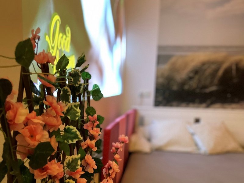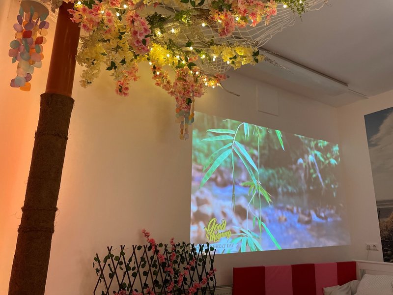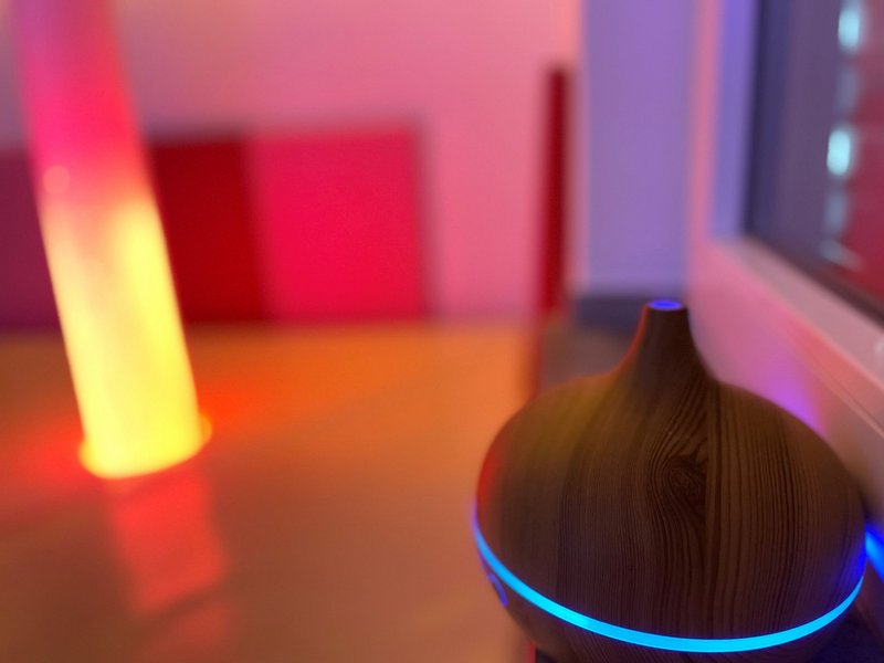 Sanfte Lichteffekte, ein Diffuser, entspannte Musik und ein Beamer laden ein, Zeit in dem Raum zu verbringen.