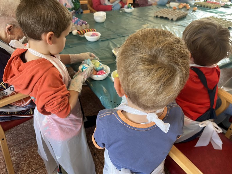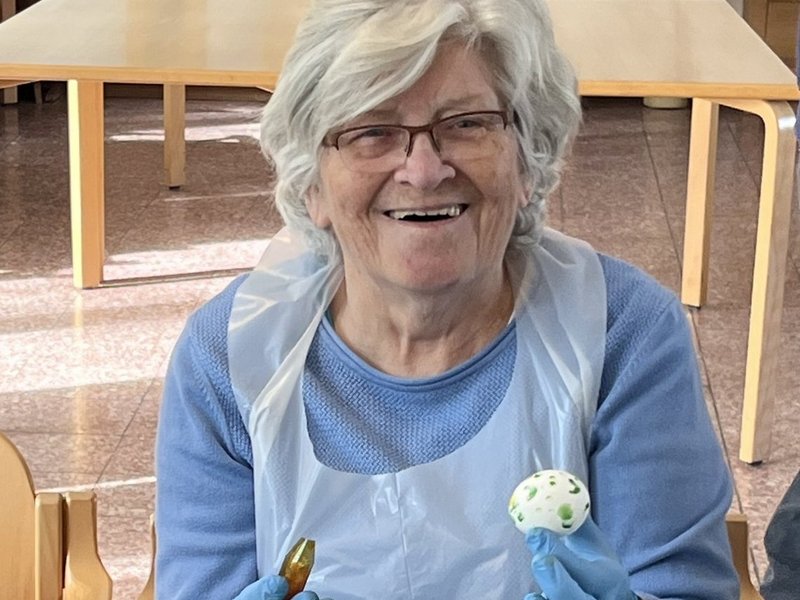 Am Donnerstag wurde es bunt: Zusammen mit den Kindern des Kindergartens Kinderland gestalteten unsere Bewohnerinnen und Bewohner farbenfrohe Ostereier. Die Junge Pflege startete den Tag mit einem gemeinsamen Frühstück im Café, bevor der Nachmittag entspannt ausklang.